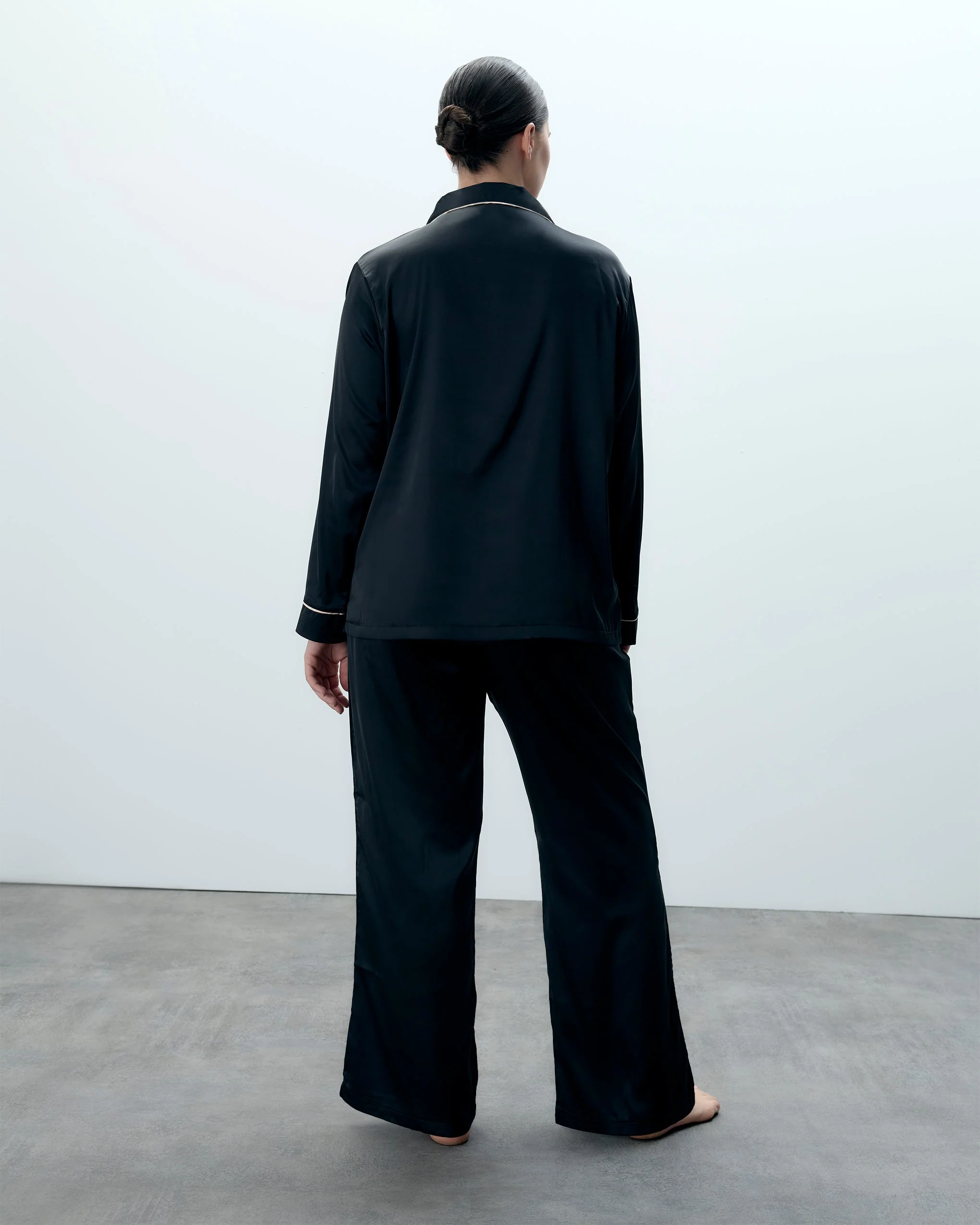 The soft  satin shirt is trimmed with  satin piping along the collar, pocket and cuffs, while the trouser is finished with a large black satin bow for a modern take on a classic pyjama look.