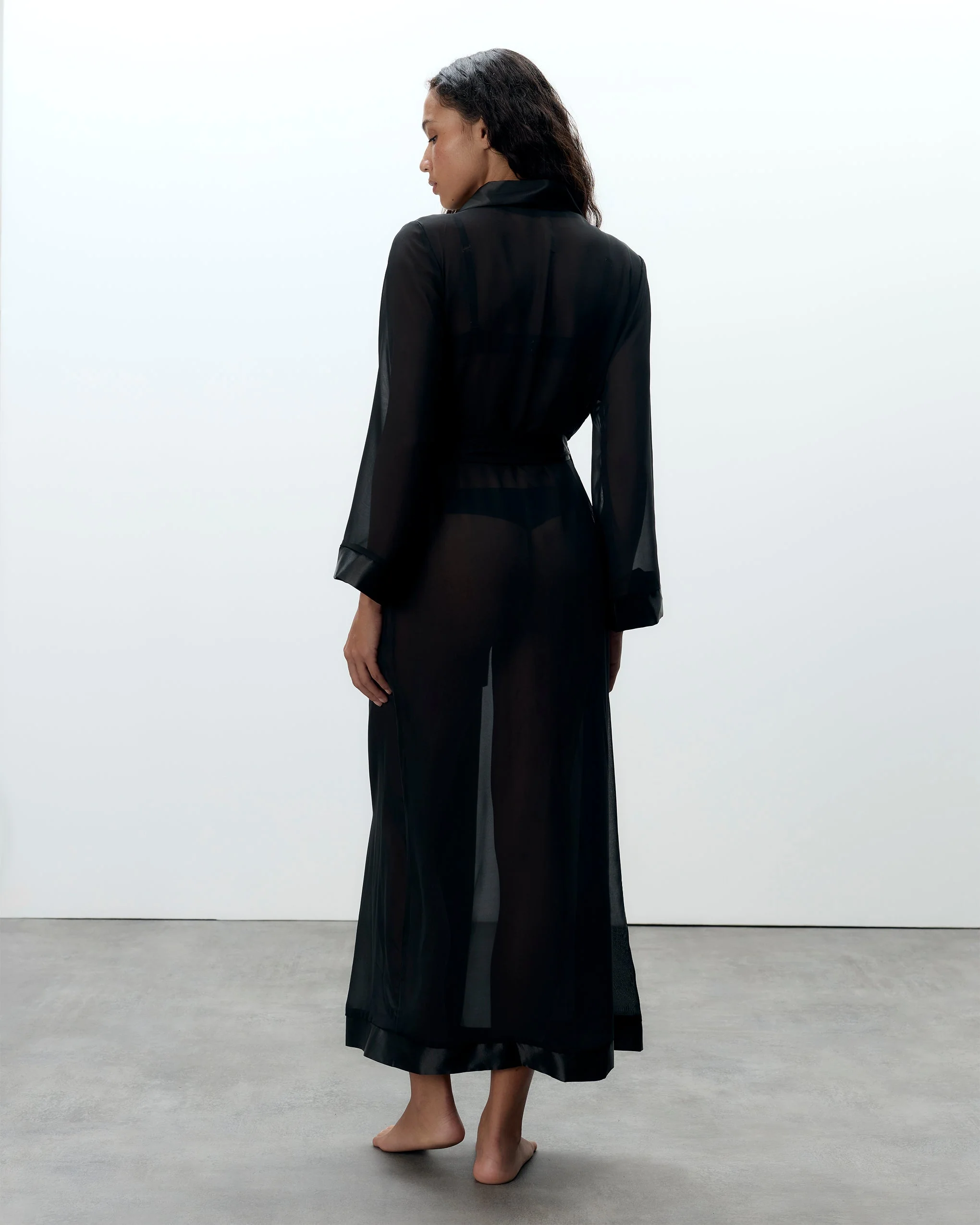 This full length luxurious chiffon kimono is a must-have item to complete your lingerie and nightwear wardrobe.  Soft sheer chiffon, edged with a deep satin trim around the leading edge and cuffs. Luxurious satin waist tie.