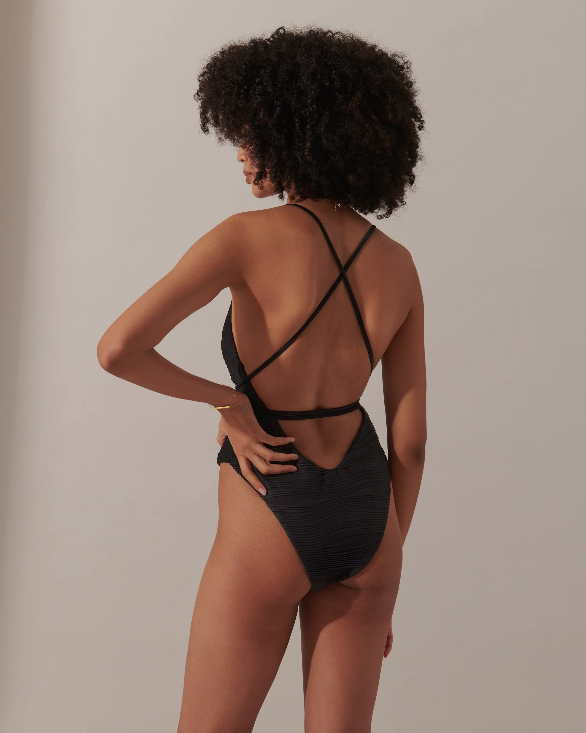 Elegant and versatile, the black Orta multi-way plunge swimsuit boasts multiple styling options with its strap-tie design. Fluid wave patterns and tactile fabrics offer an elegant touch, while the multi-way design adds a contemporary twist, perfect for all your styling needs.